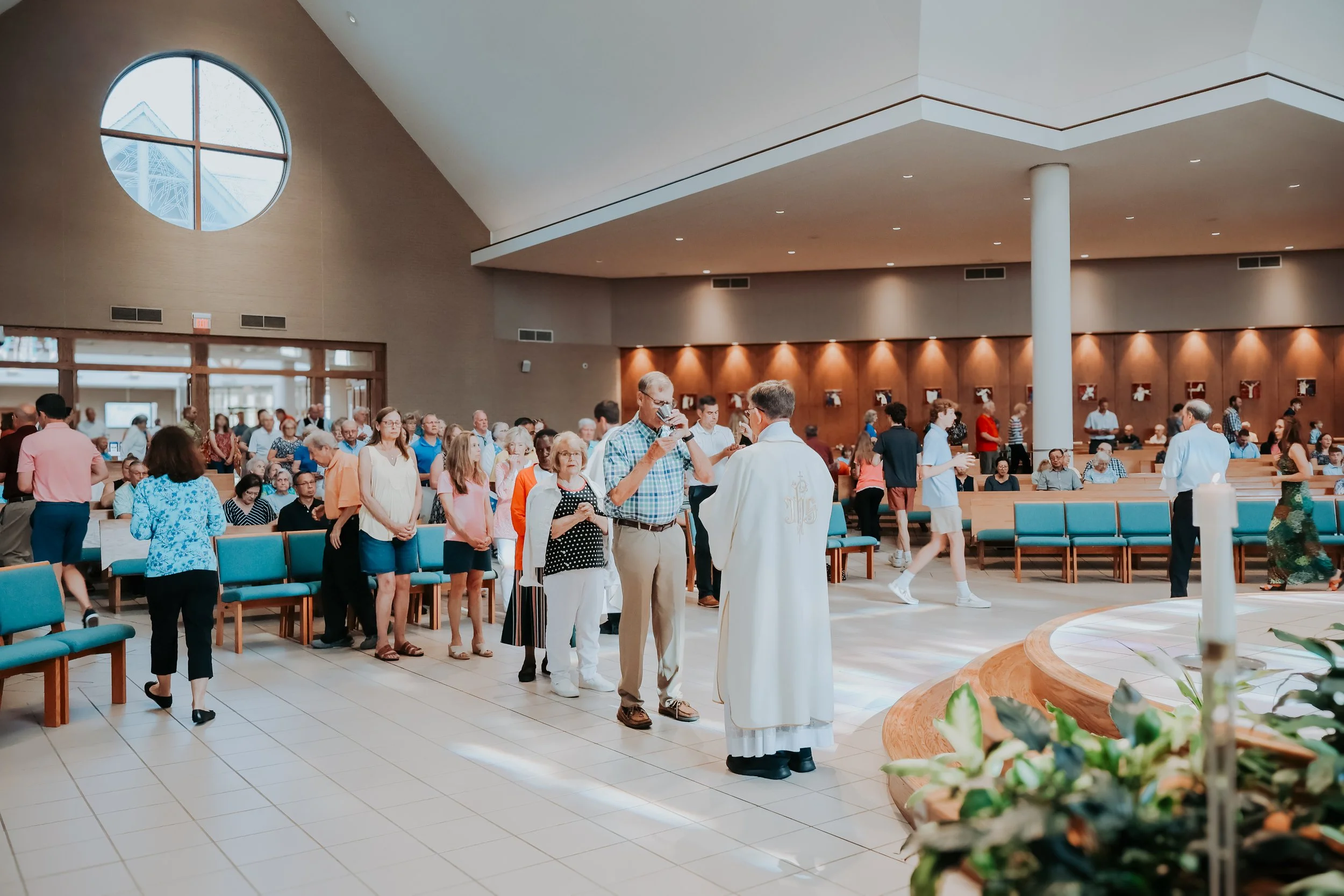 Adults usually receive their First Eucharist at the Easter Vigil through the OCIA process, often alongside Confirmation. Contact Joe Ollier at jollier@mgparish.org to learn more.