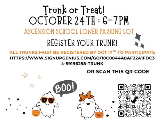 Ascension School’s PTO is hosting its first ever family friendly Trunk or Treat Night in the Ascension Parking Lot.